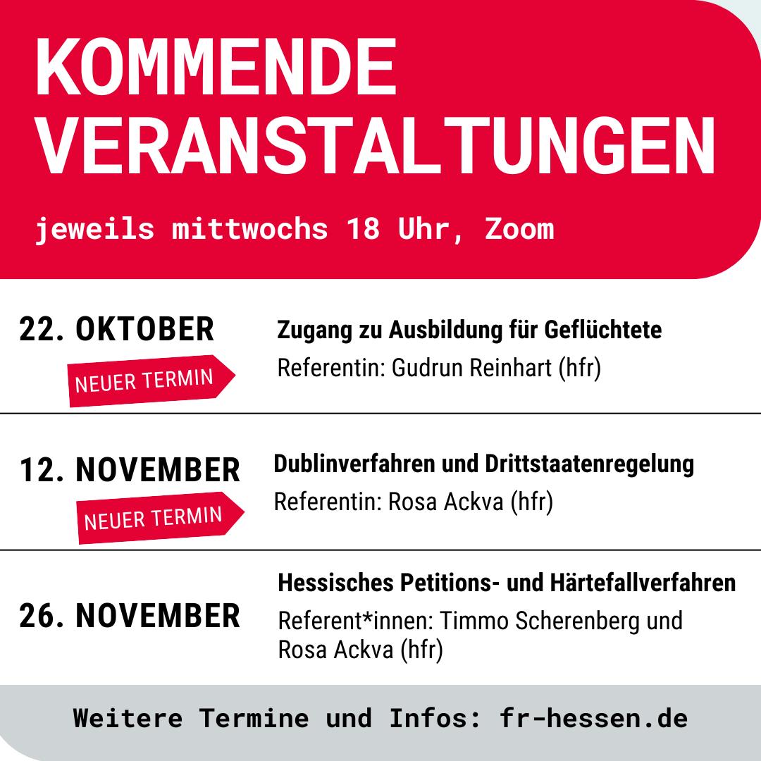 Der Hessische Flüchtlingsrat bietet mittwochs um 18h Online-Schulungen zu verschiedenen Themen des Asyl- und Ausländerrechts an. Die Veranstaltungen finden jeweils am 2. und 4. Mittwoch eines Monats statt.